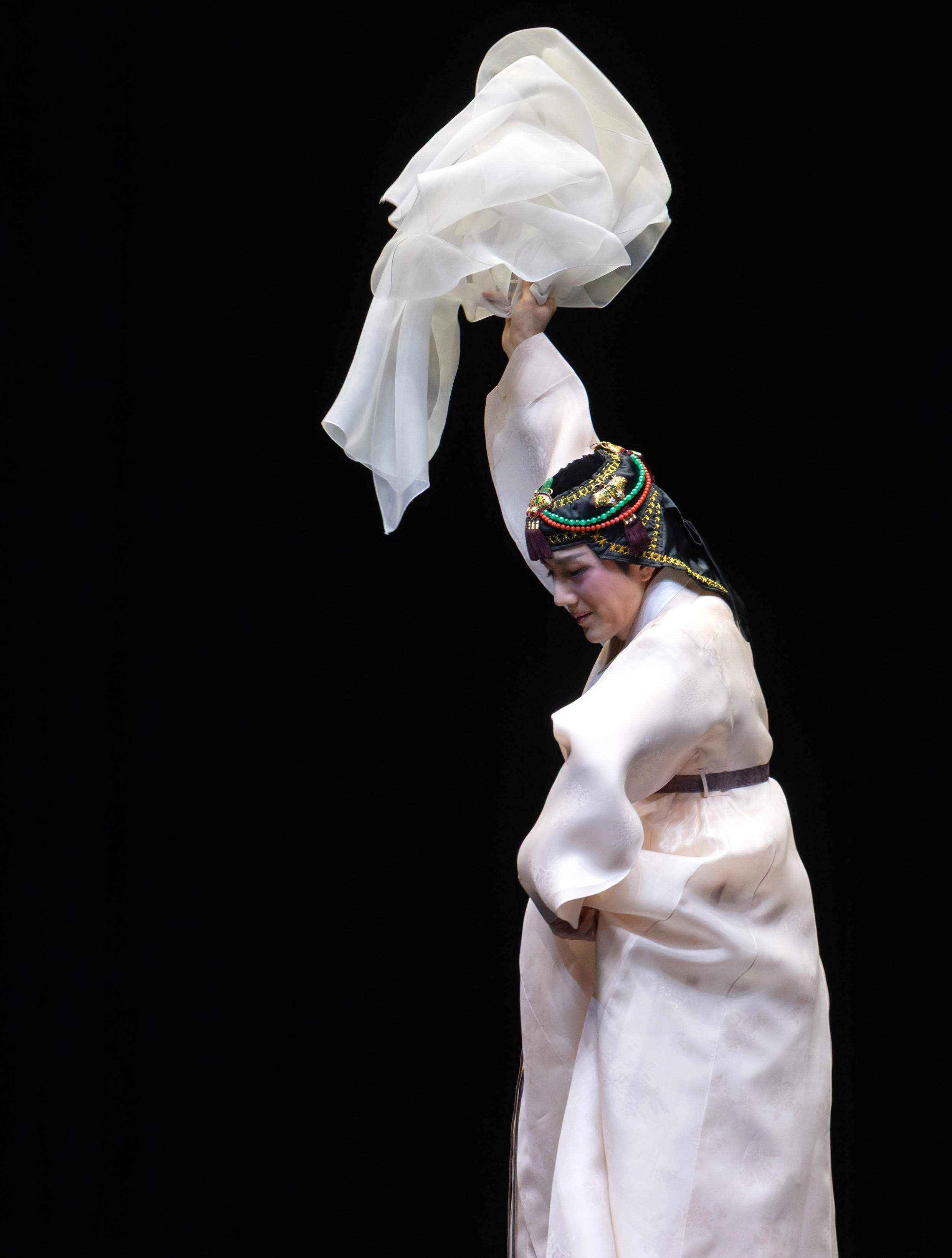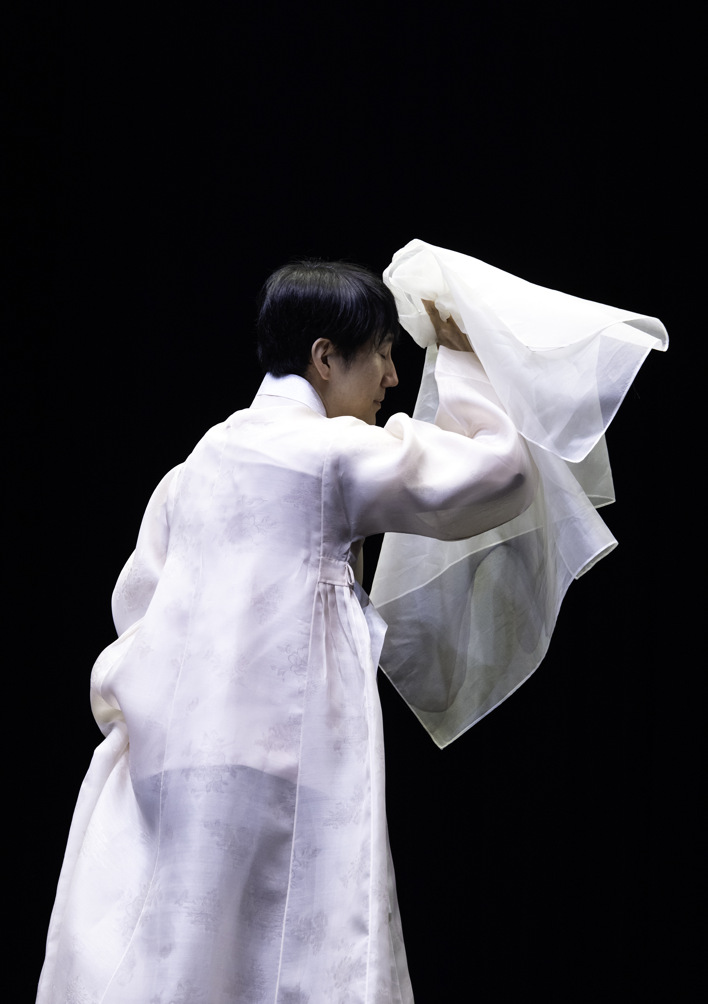 수건을 흔들고 , 날리고, 움켜쥐고, 내던지며 ,