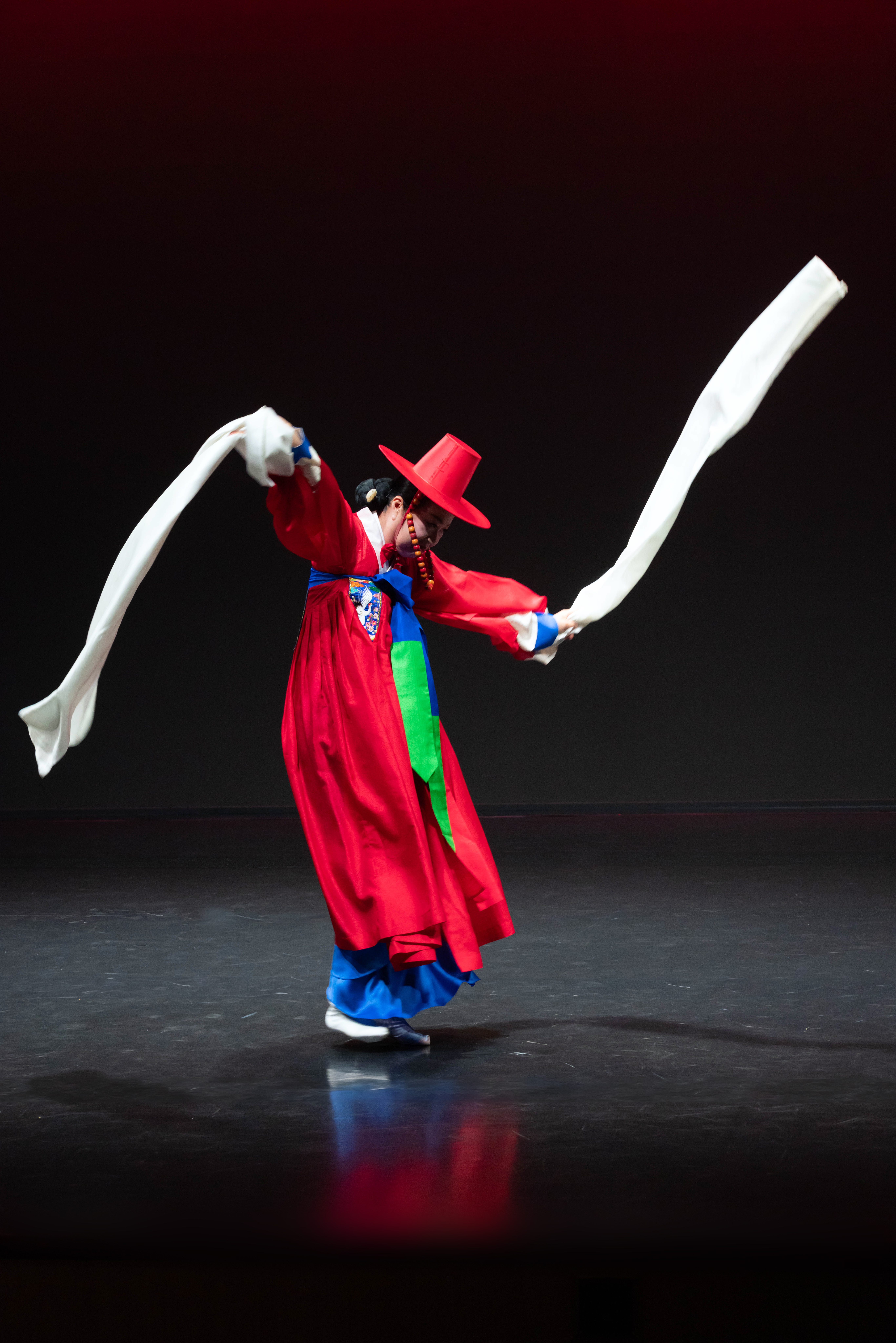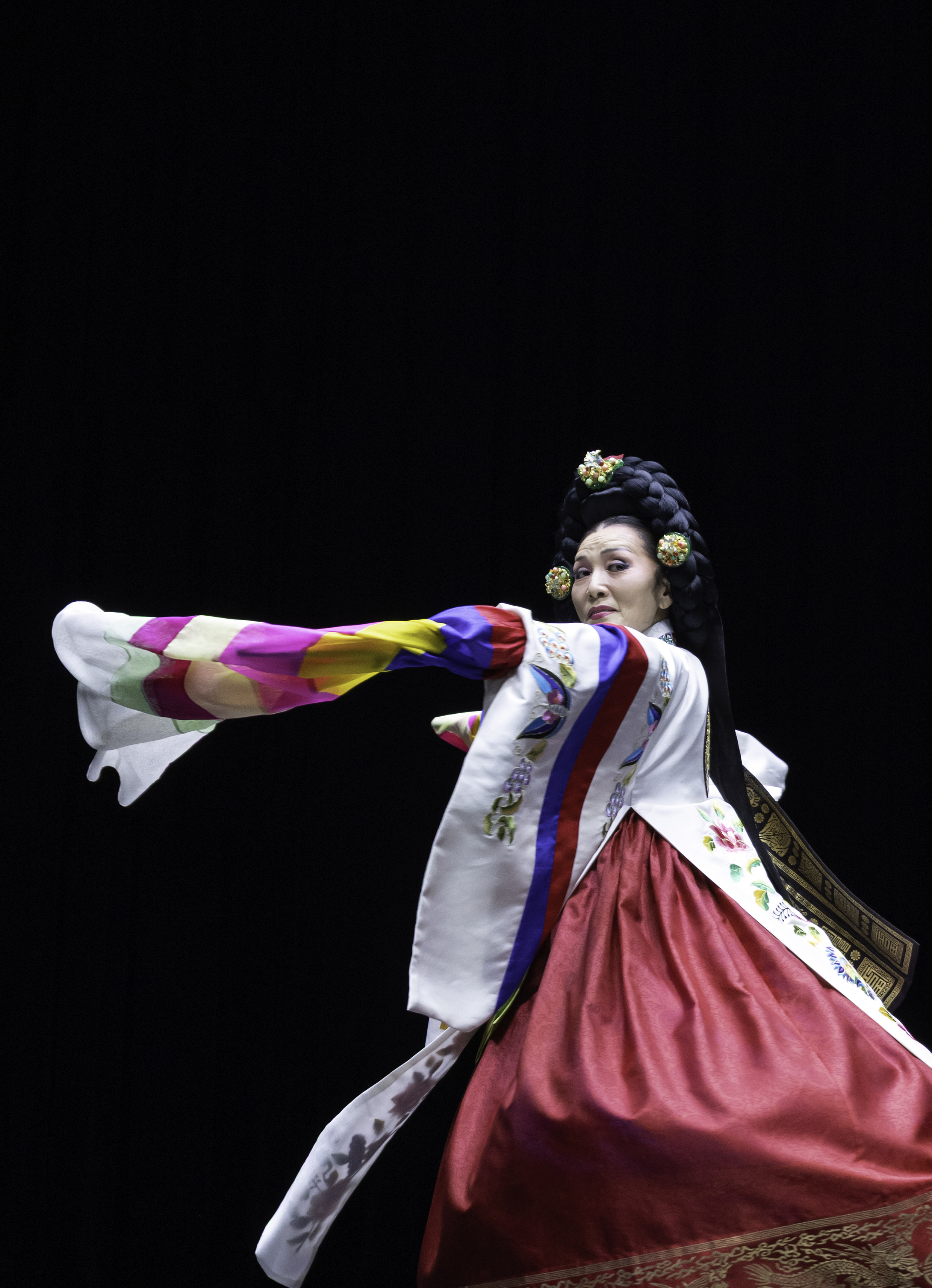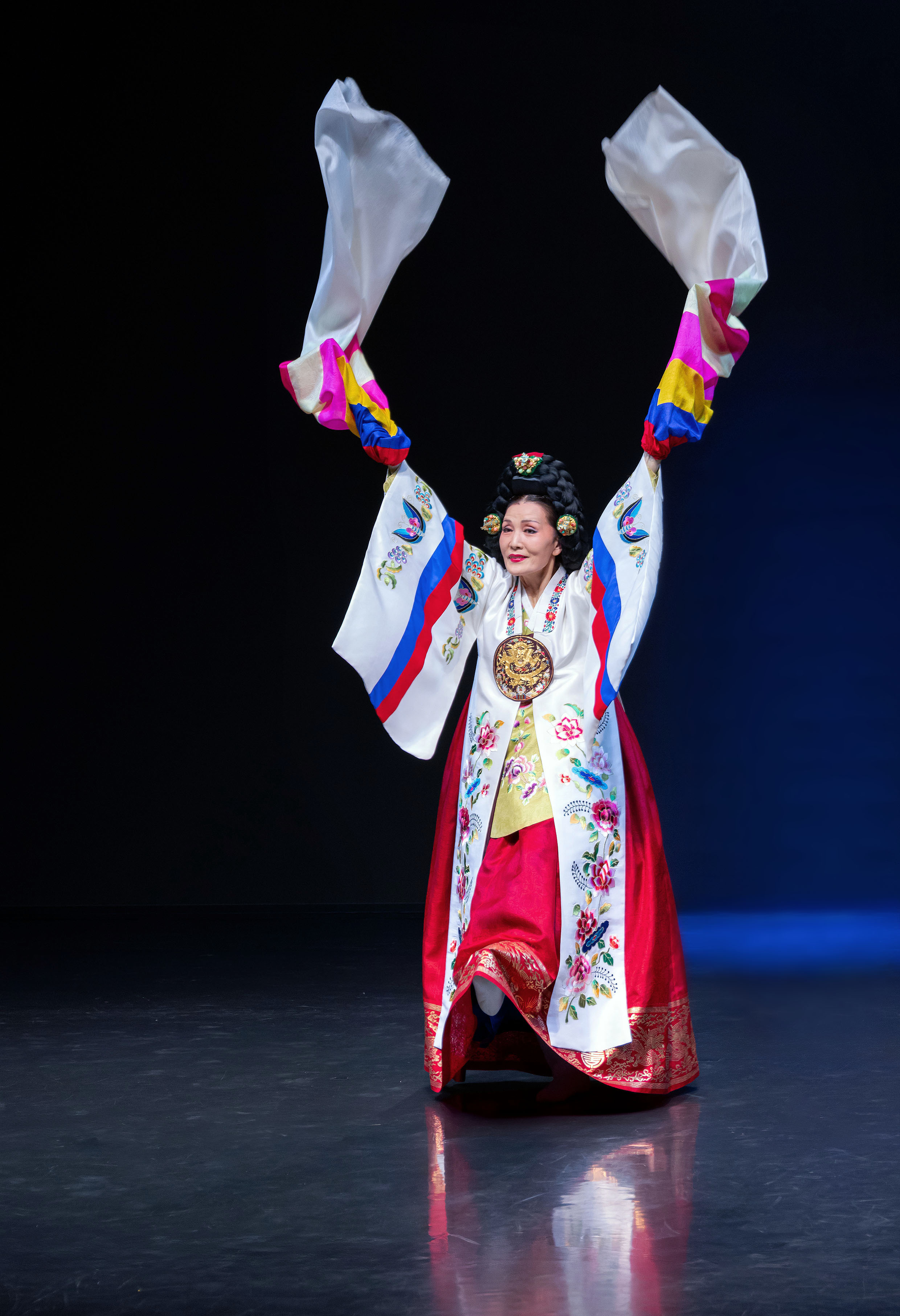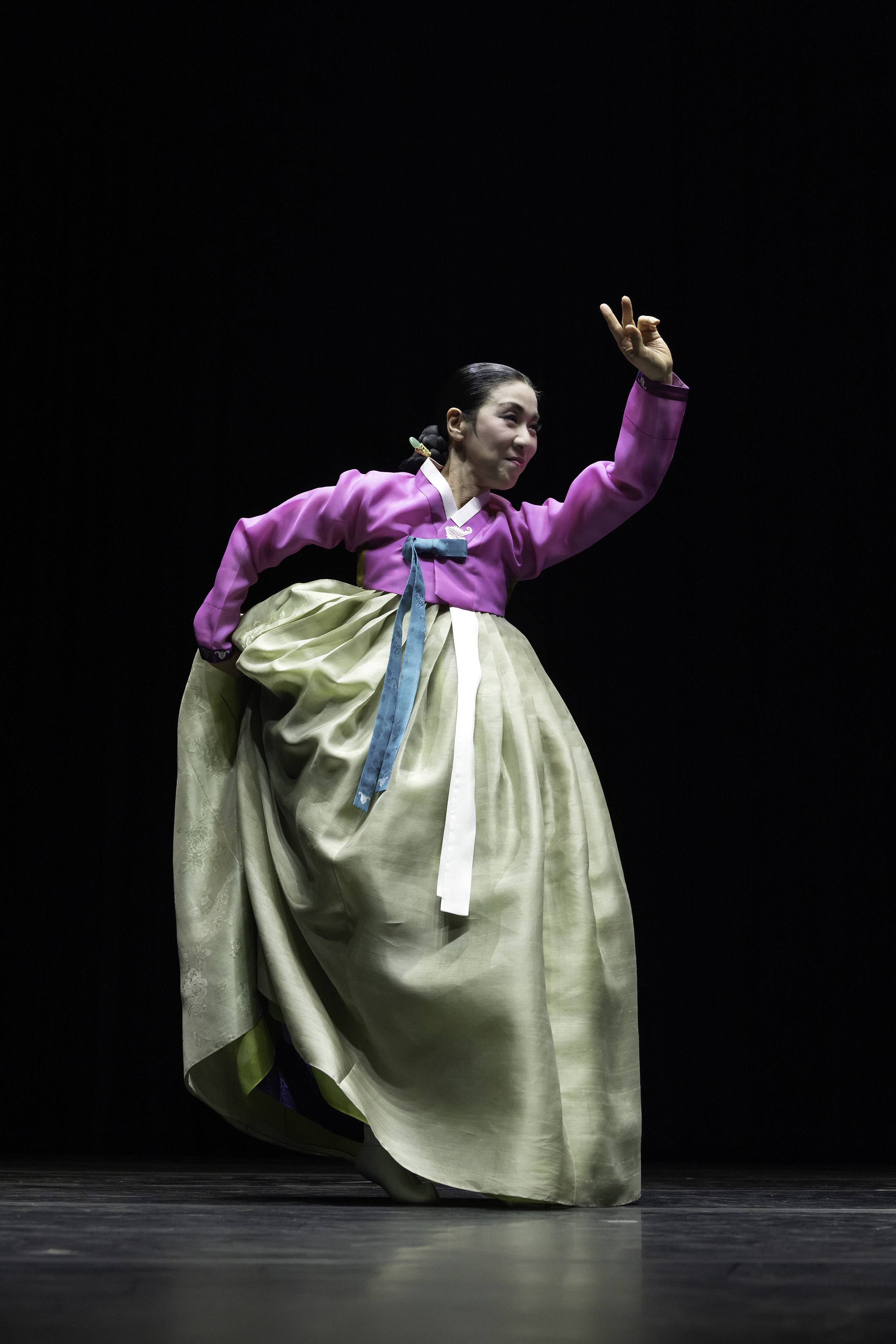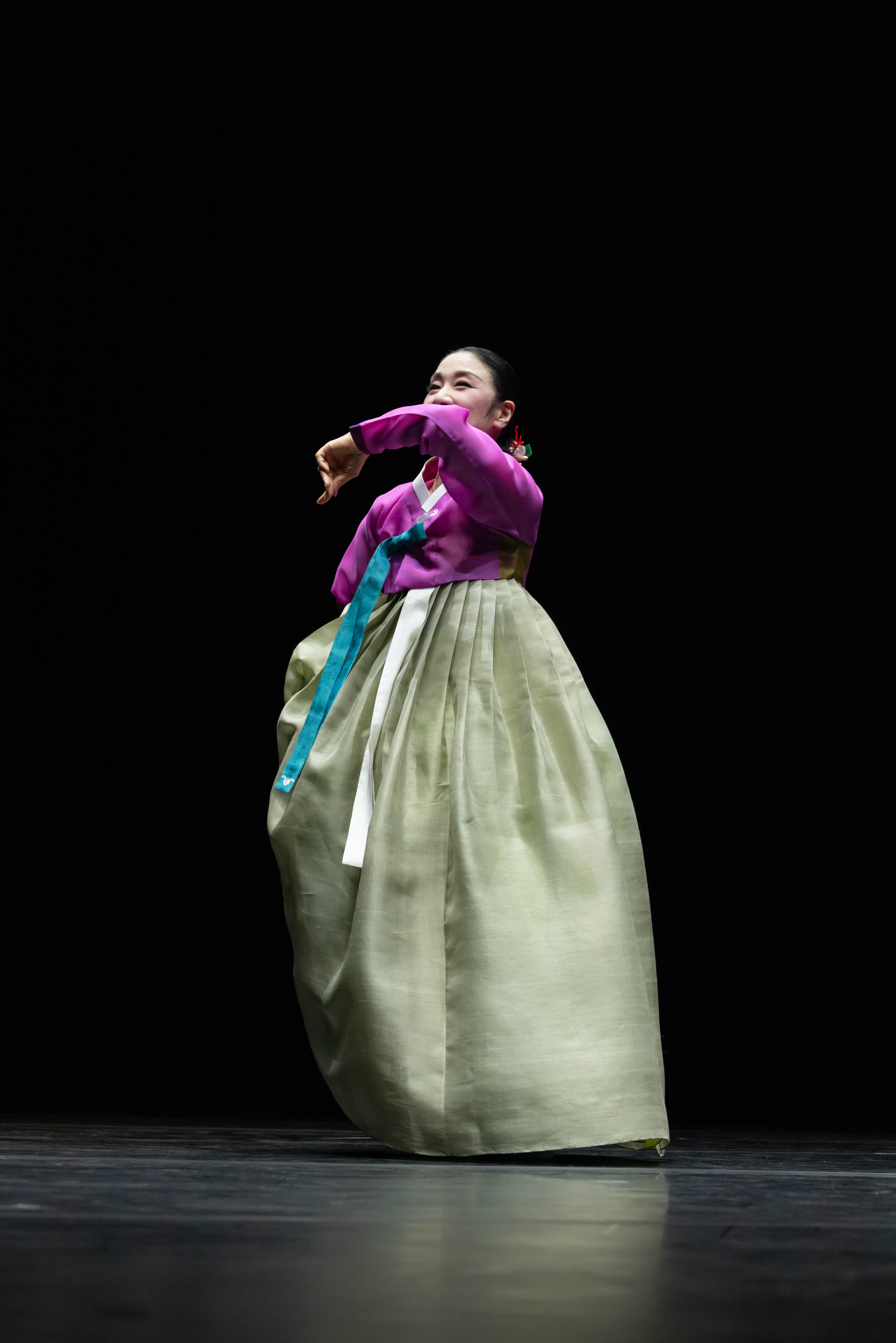 태평'이라는 말은 ‘나라가 평안하다’는 뜻으로, 태평무는 나라의 태평성대와 왕의 장수를 기원하는 의미를 담고 있는 춤입니다. 한 명 또는 두 명이 추며, 왕후나 여왕의 위엄과 기품을 표현하는 여성무용입니다. The word 'Taepyeong' means 'the country is at peace', and Taepyeongmu is a dance that carries the meaning of wishing for the country's peace and longevity of the king. It is a female dance performed by one or two people, expressing the dignity and elegance of a queen.